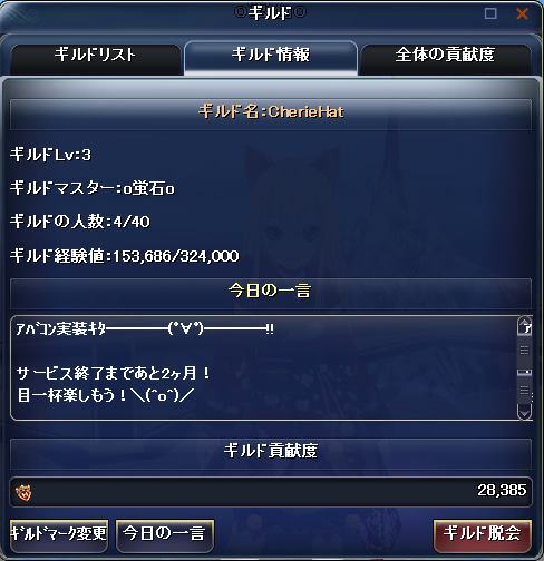 とりあえずサービス終了まであと一ヶ月… すごく…楽しかったよ、タルタロス… いい思い出でした。 さて、とりあえずサービス終了までにやりたい事をメモメモ(ノ)・ω・(ヾ) *シナリオを全部見る!(休みの日に一気に見るぜ!) *ルコを70代・バルを60代後半にする *サービス終了までに今現在ゲット出来るアバのSS撮ってブログに載せる! *アカシャの羽衣欲しいなぁ…(´・ω・`) シナリオは見ようと思えばいつでも見れるので(ぇ)、今の目標は目下疲労ですね! 最近疲労がめっきりご無沙汰… とりあえずルコにゃんとバルだけでも育てたい…!!! |