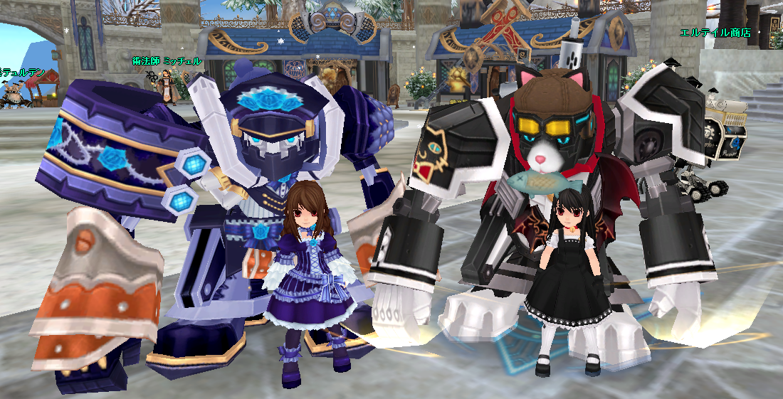 そして、髪型もアバも変えまして… こんな感じに(*゚∀゚) エルテイル監査官のボルビアン・シェードの双子のアバです(*`・ω・´*) ついでに ゴシックアバも\(^o^)/ これ実は外見変更してたり… 錬金も無料だし、ボックスも無料だから安易にゲット出来るものは外見変更しまくってます…(*゚∀゚) |